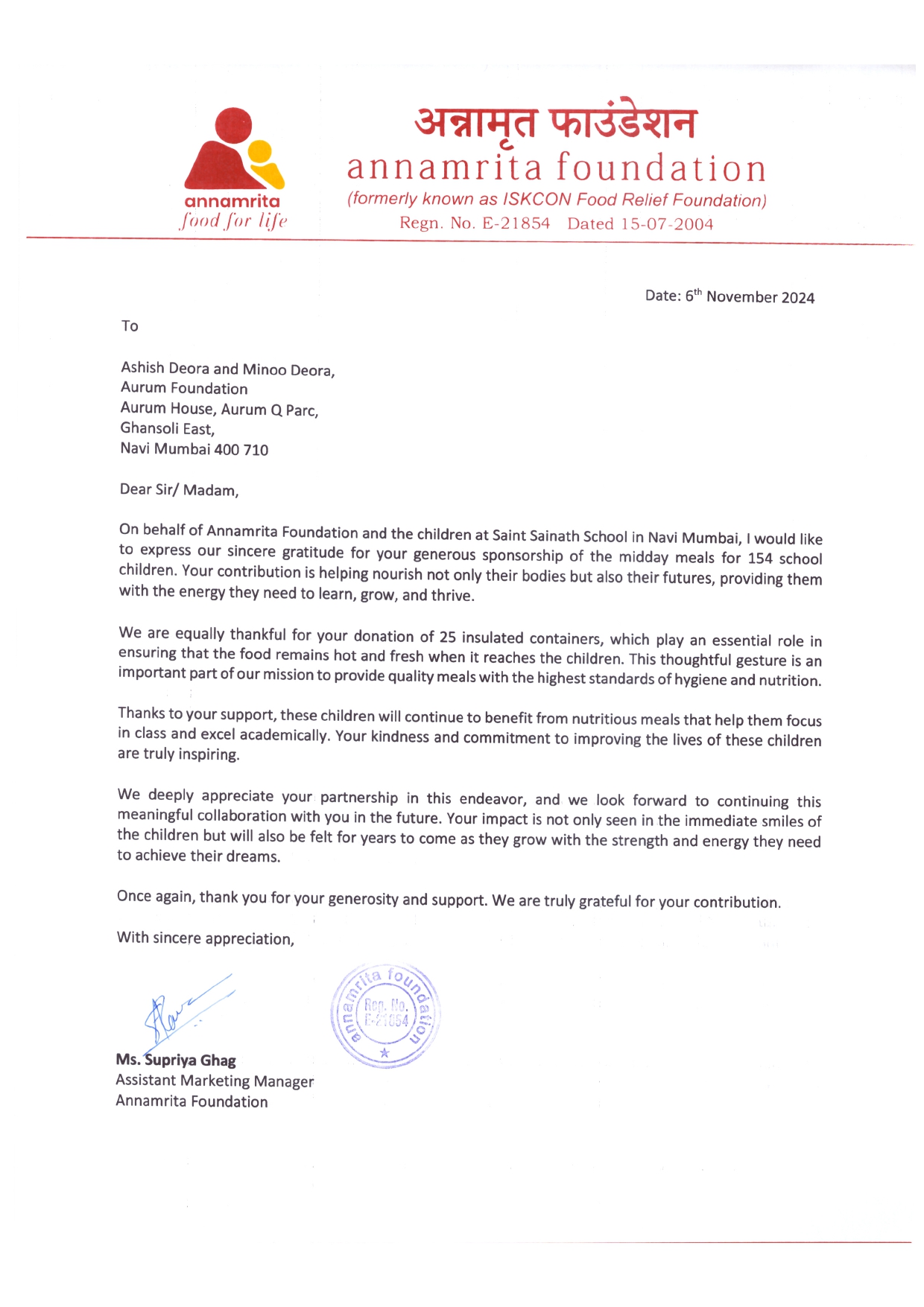 Our association with Mumbai Roti Bank since 2018 is aligned with one of our 6 core pillars of “Nutritious Meals”. We are trying to lend a helping hand in fighting against malnourishment amongst children.